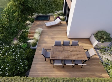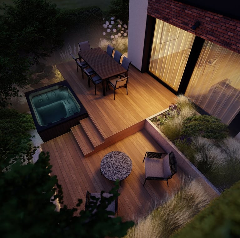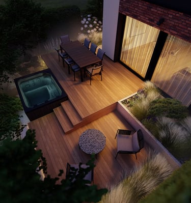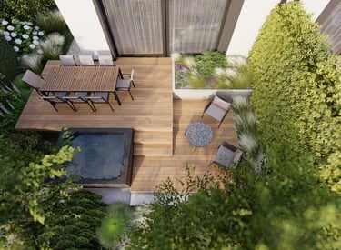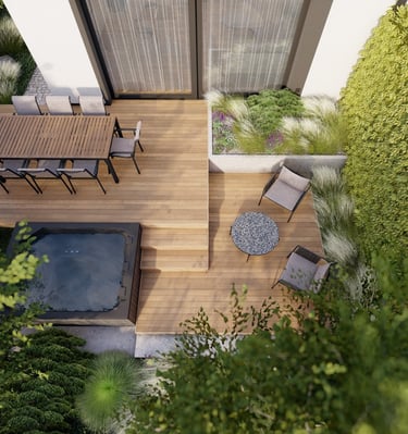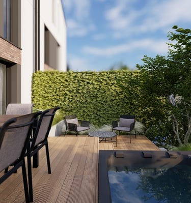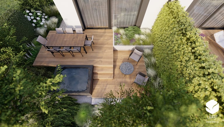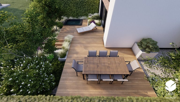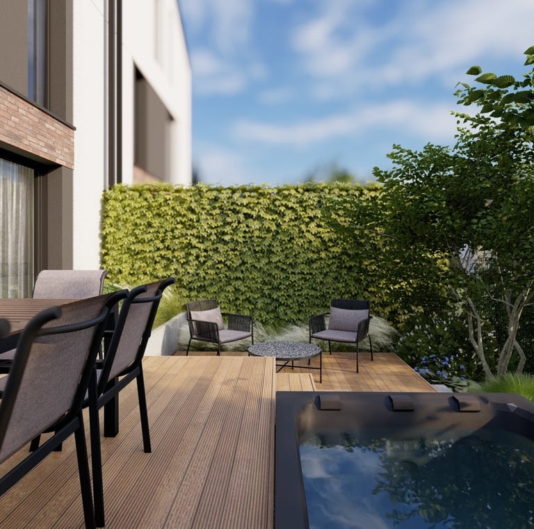 Exceptional exterior architecture elevates any area, featuring seamlessly blended elements such as lively plants, generous terraces, and designated spots for a jacuzzi, creating an ideal atmosphere for unwinding outdoors.